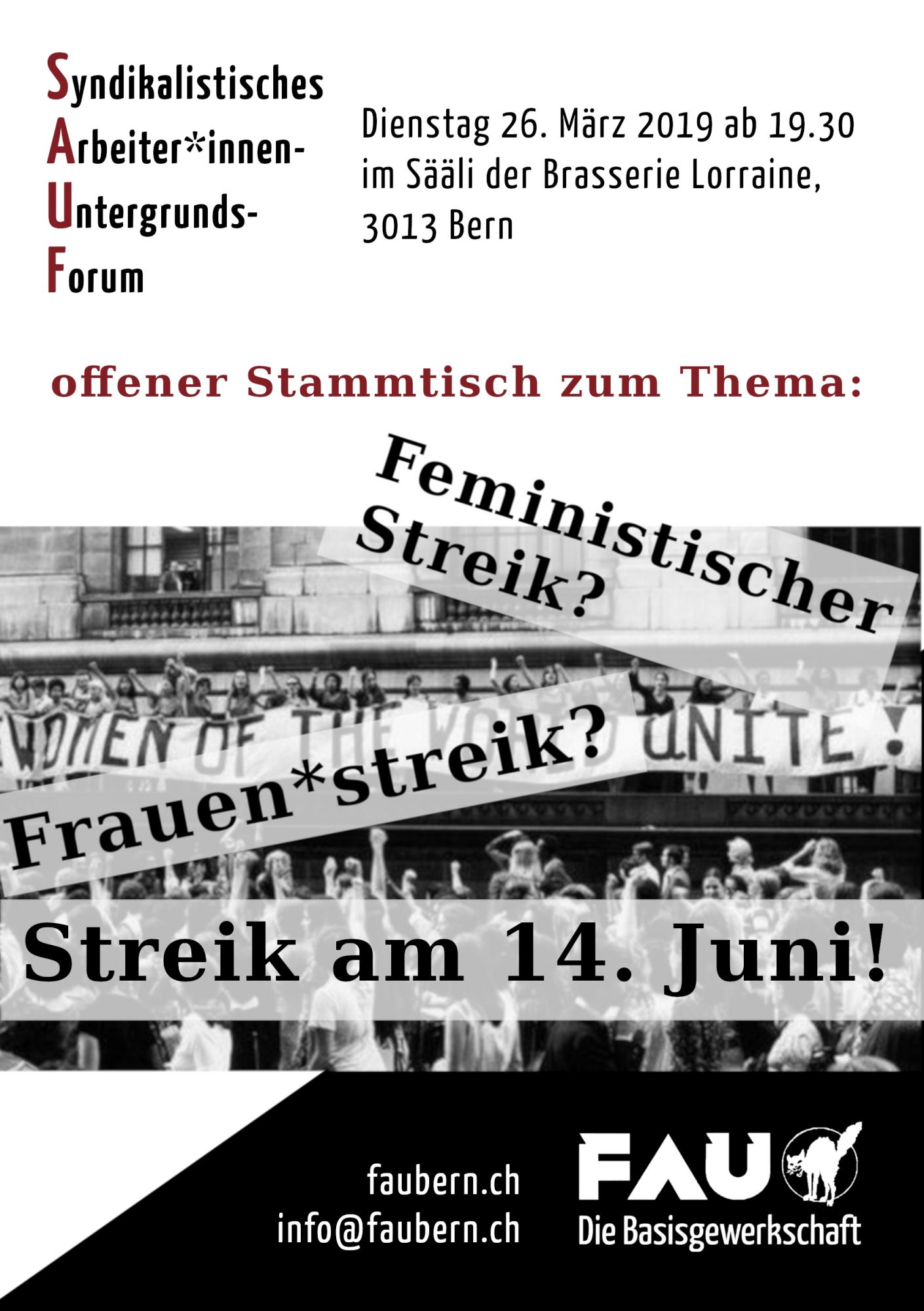 Jeden vierten Dienstag im Monat lädt die Basisgewerkschaft FAU Bern zu einem ungezwungenen Austausch, dem SAUF (Syndikalistisches Arbeiter*innen-Untergrunds-Forum) ein. Es soll eine Diskussionsplattform sein, welche ein Lernen von unten ermöglichen soll. Bei Bier, Eistee oder sonst was soll sich jeden Monat einem Thema gewidmet werden. Das SAUF ist keine Vortragsreihe, sondern ein ungezwungener Austausch untereinander. Komm doch mal vorbei, wir freuen uns.