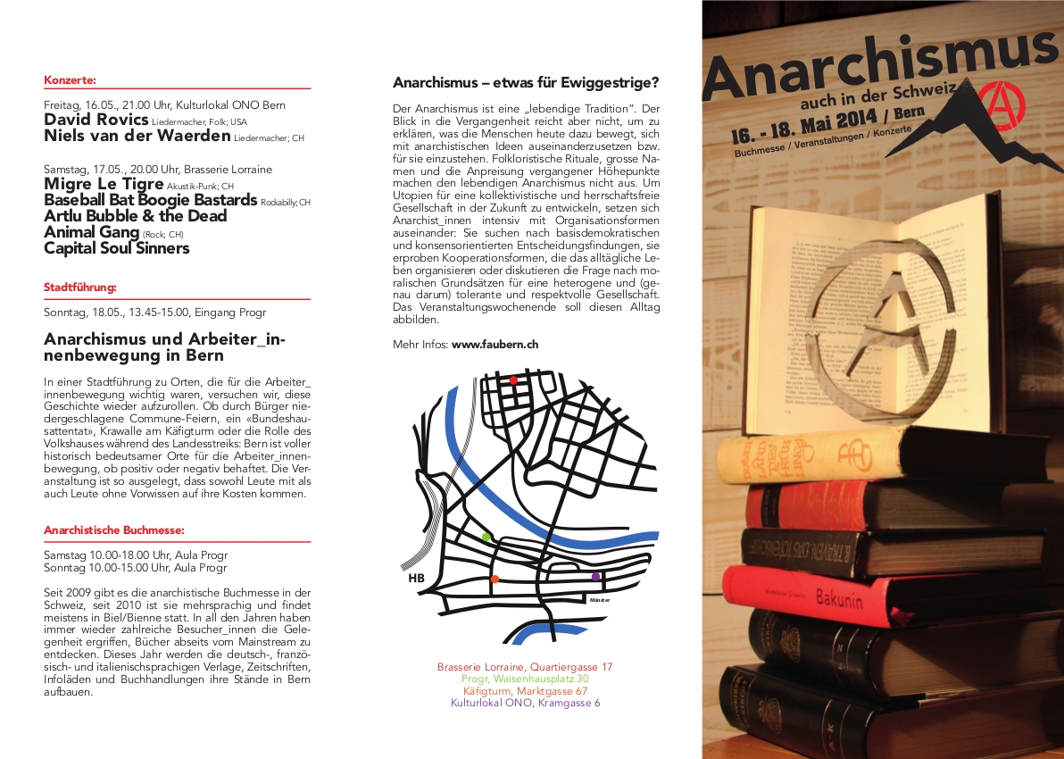 Im vergangenen Mai fanden in Bern diverse Veranstaltungen zum Thema "Anarchismus - auch in der Schweiz" statt. Dazu gehören eine Buchmesse, diverse inhaltliche Veranstaltungen und Diskussionsrunden, zwei Konzertabende sowie ein Stadtrundgang.