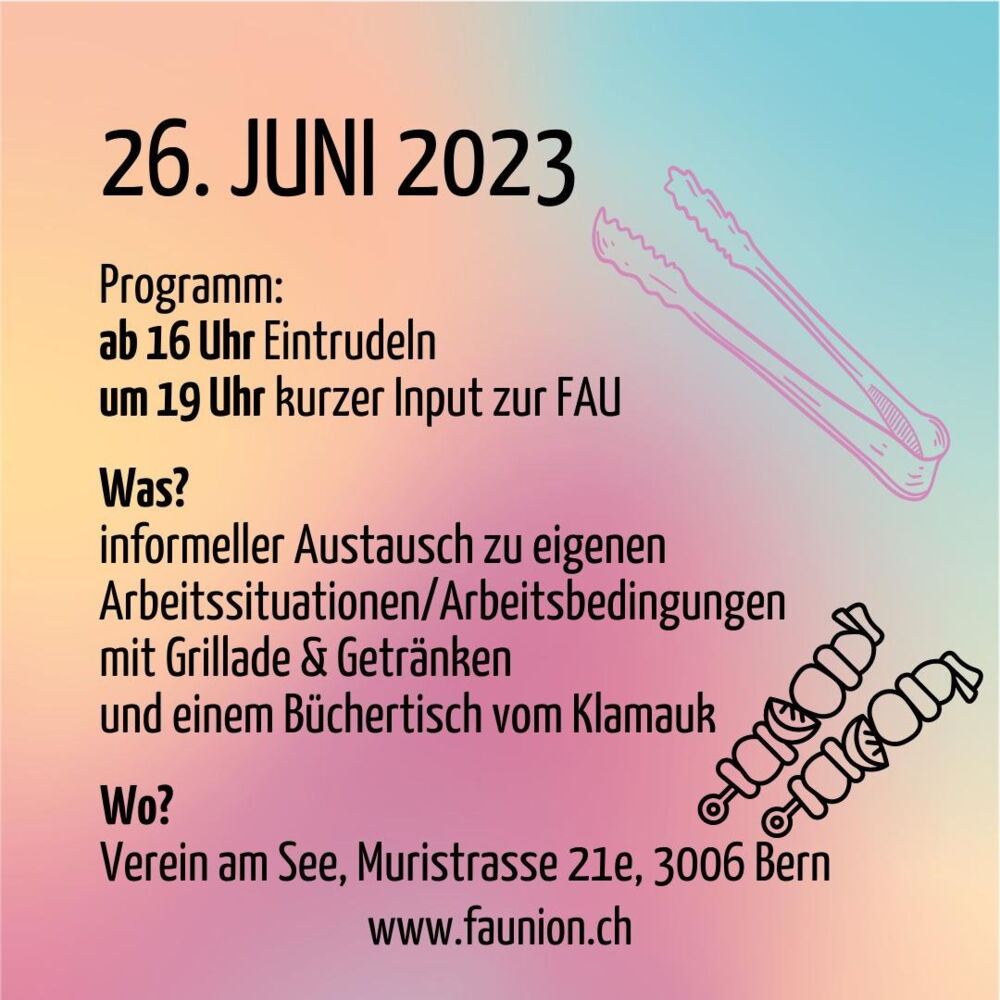 Komm zum Sommer-Event vom Branchensyndikat Soziales! Wir machen Raum, damit sich Sozis austauschen und kennenlernen können. Um 19:00 gibt es einen kleinen Input über die FAU, wie unsere Gewerkschaft aufgebaut ist und die Möglichkeiten, sich als Sozi in der FAU zu organisieren. Ebenfalls wird es einen Büchertisch geben, der speziell für Sozis zusammengestellt wurde. Der Sommerevent findet an der Muristrasse 21e in Bern statt und beginnt um 16:00. Bitte bringt selbst Grilladen mit, der Grill wird von uns bereitgestellt. Wir freuen uns auf euch!