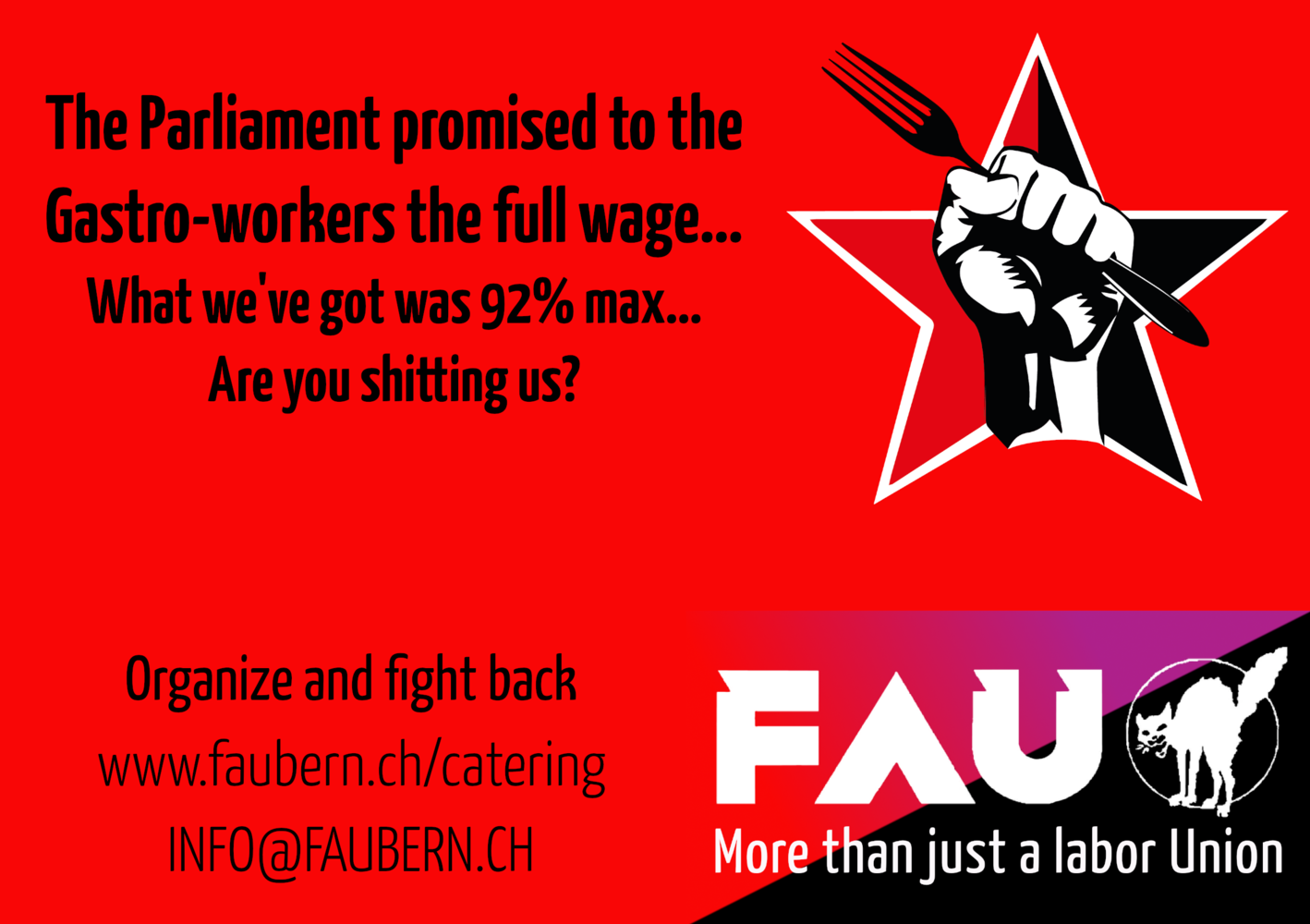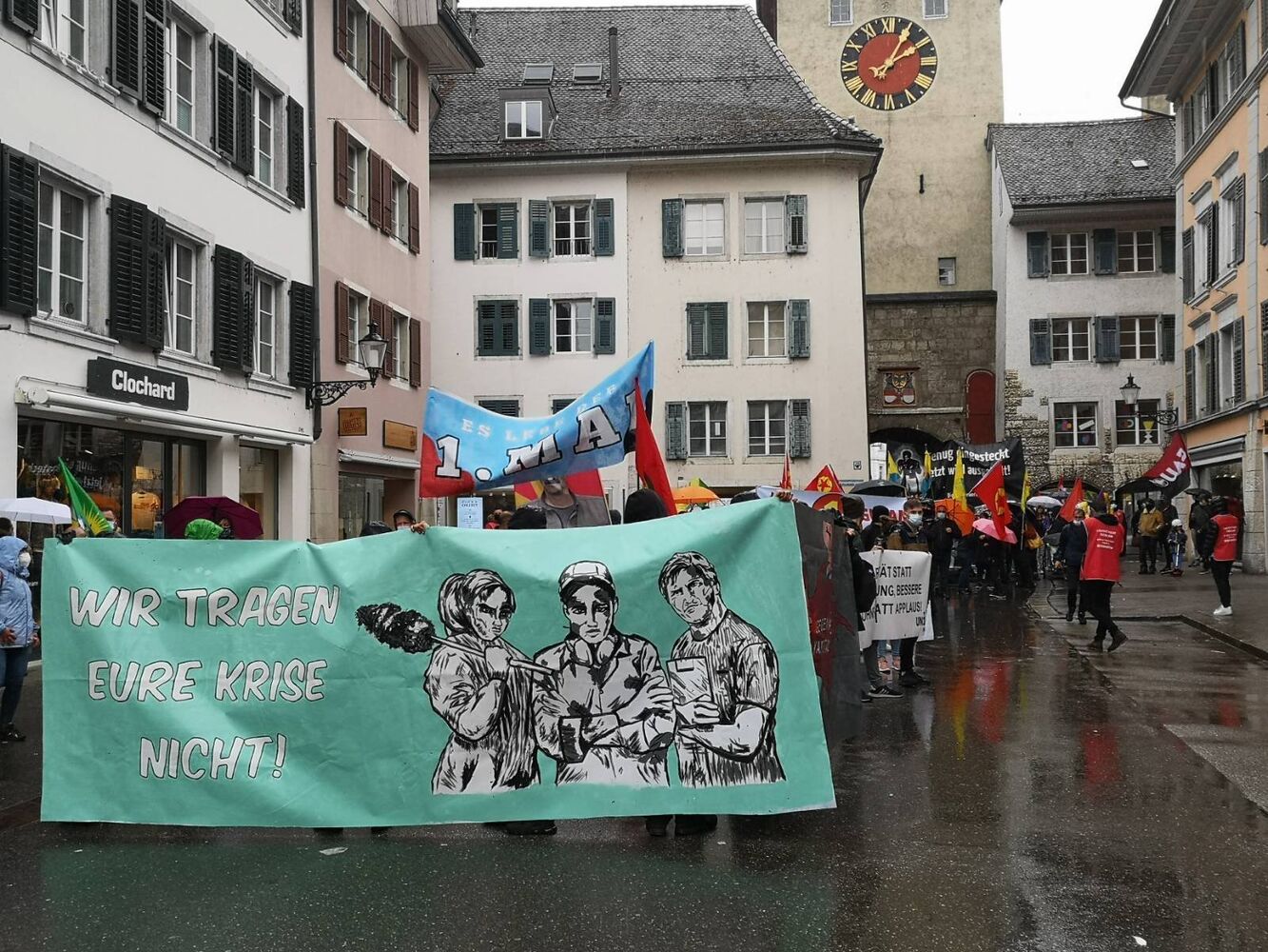 Despite the rain, people all over Switzerland took to the streets on Labor Day and voiced their displeasure about inequality. The FAU was present at the militant demonstration in Solothurn as well as in Lucerne.