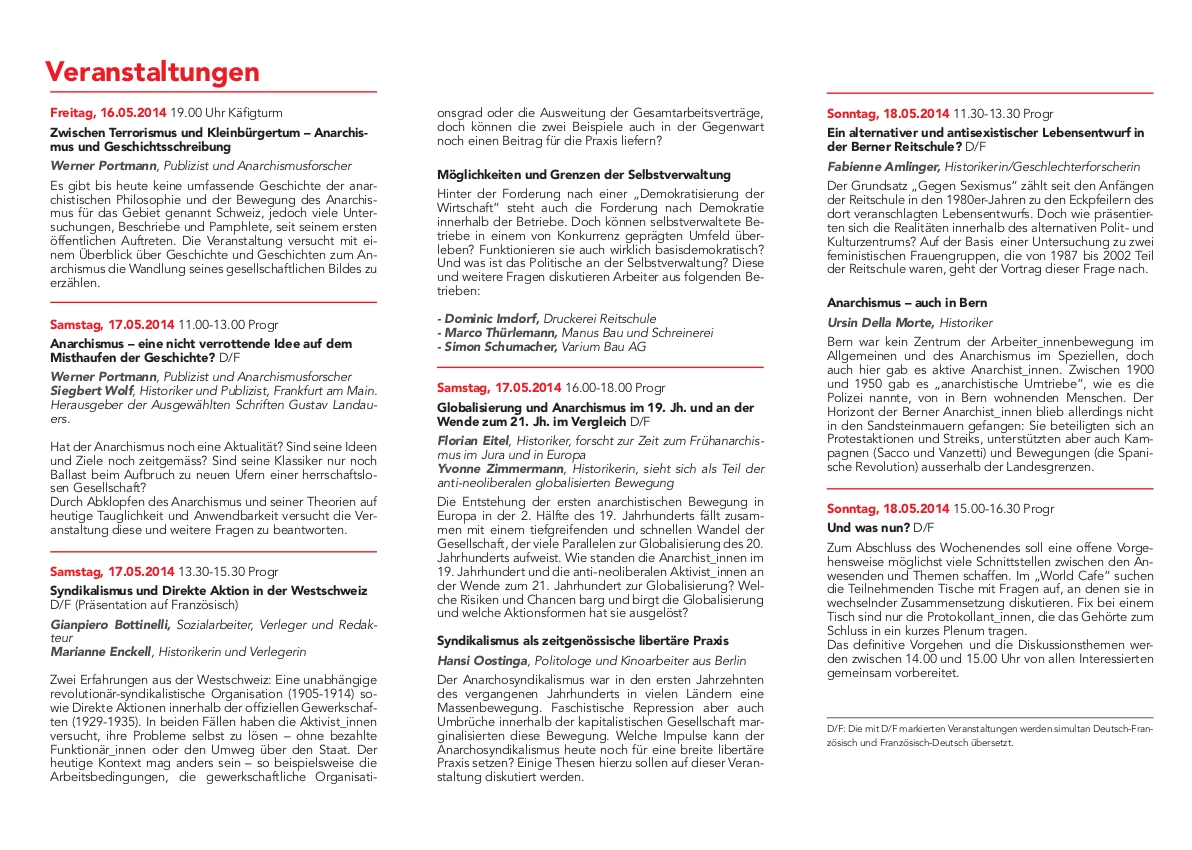 Der Anarchismus ist eine „lebendige Tradition“. Der Blick in die Vergangenheit reicht aber nicht, um zu erklären, was die Menschen heute dazu bewegt, sich mit anarchistischen Ideen auseinanderzusetzen bzw. für sie einzustehen. Folkloristische Rituale, grosse Namen und die Anpreisung vergangener Höhepunkte machen den lebendigen Anarchismus nicht aus. Um Utopien für eine kollektivistische und herrschaftsfreie Gesellschaft in der Zukunft zu entwickeln, setzen sich Anarchist_innen intensiv mit Organisationsformen auseinander: Sie suchen nach basisdemokratischen und konsensorientierten Entscheidungsfindungen, sie erproben Kooperationsformen, die das alltägliche Leben organisieren oder diskutieren die Frage nach moralischen Grundsätzen für eine heterogene und (genau darum) tolerante und respektvolle Gesellschaft. Das Veranstaltungswochenende sollte diesen Alltag abbilden.