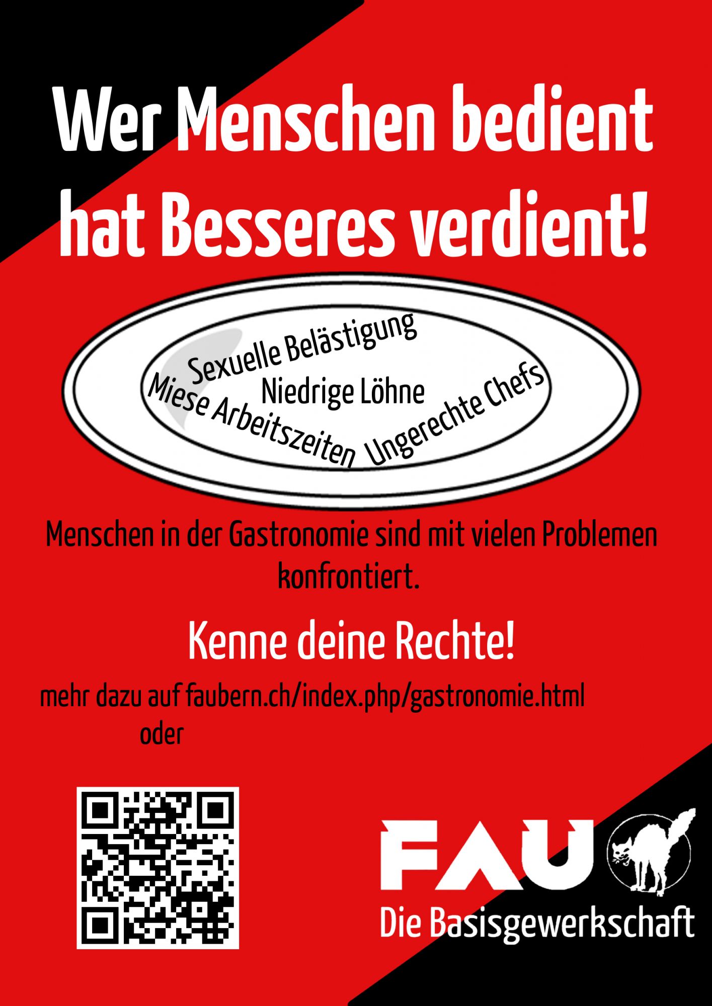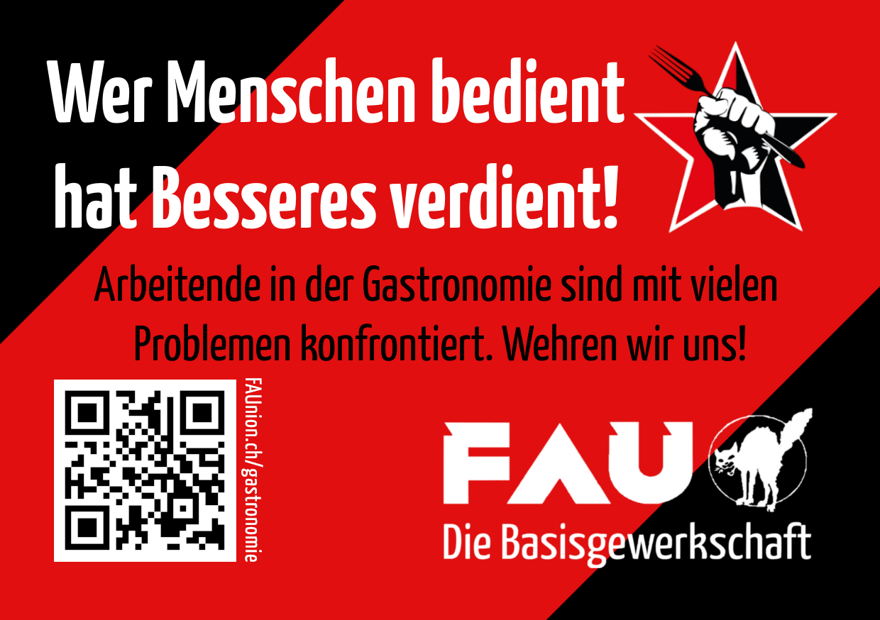 Schweizweit arbeiten 244'000 Menschen im Gastgewerbe. Meist arbeiten sie Teilzeit, unter massivem Stress und teilweise ohne Mindestlohn. Zur Liste prekärer Arbeitsbedingungen kommen dann meist noch sexuelle Übergriffe, miese Chefs und geringe Schichtsicherheit hinzu. Sprich: Wenig Lohn für beschissene Arbeitsbedingungen. Die FAU Bern fordert alle Beschäftigten der Gastronomie auf, sich selbstorganisiert für bessere Arbeitsbedingungen einzusetzen!