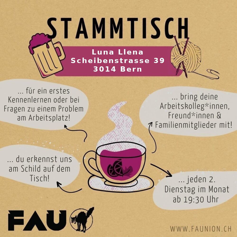 Stammtisch heisst für uns beisammen sein, über Politik oder eben auch nicht zu reden, und wie es uns mit der Arbeit oder persönlich geht. Der Stammtisch ist auch eine niederschwellige Chance, Die FAU und ihre Praxis kennenzulernen und die Leute dahinter. Also auch geeignet für Neumitglieder.