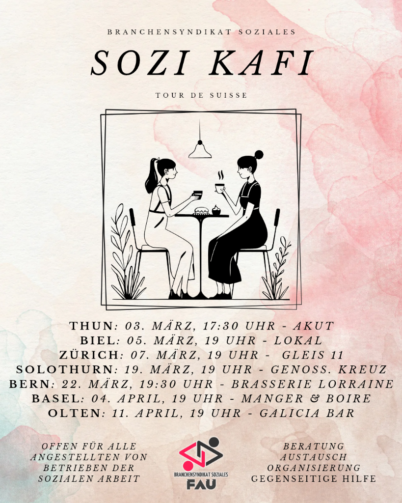 Das Branchensyndikat Soziales ist eine selbstorganisierte Gewerkschaft für alle Menschen, die im Sozialbereich arbeiten (FaBe, Sozpäd, Sozialarbeiter*innen etc.). Mit dem Sozi Kafi wollen wir in der ganzen Schweiz Stammtische organisieren, um uns über die Herausforderungen, denen wir tagtäglich begegnen, auszutauschen und zu vernetzen.