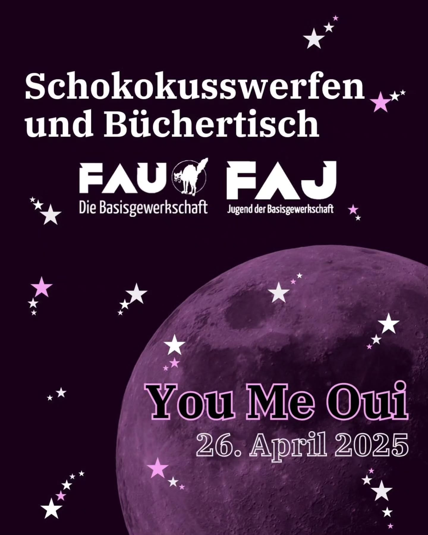 Auch dieses Jahr wird es wieder eine Vorfeier für den ersten Mai geben. Die FAU und FAJ werden mit eine Schokokuss-Werfen und Infostand präsent sein.