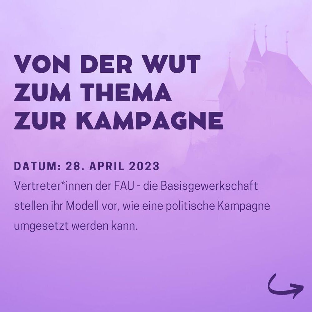 Vertreter*innen der FAU - die Basisgewerkschaft stellen ihr Modell vor, wie eine politische Kampagne umgesetzt werden kann. Vom Erfassen der Situation und des Problems über vielfältige kreative Werkzeuge bis zur Evaluation machen sie einen Abriss und geben euch das Handwerk, wie mobilisiert werden kann, wie ihr Menschen organizen könnt und wie ihr Durchschlagskraft aufbaut.