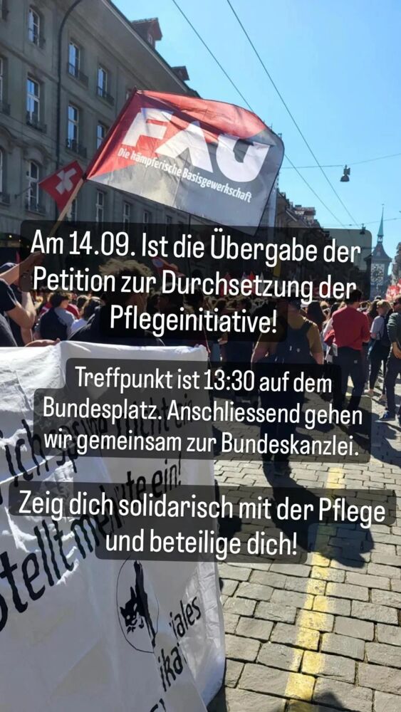 Sei auch du solidarisch mit der Pflege und komm am 14. September vorbei. Um 13.300 Uhr wird die Petition zur Durchsetzung der Pflegeinitiative offiziell übergeben.