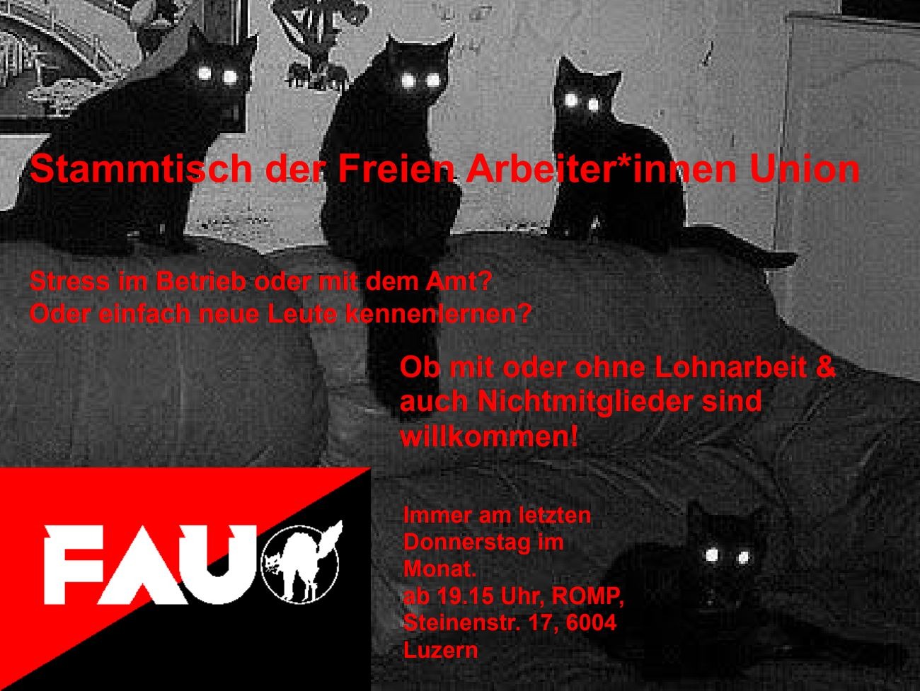 Die FAU Region Innerschweiz lädt zu ihrem ersten Stammtisch! Diskutieren, Austauschen und gemütliches Beisammensein. Kommt vorbei! Wir freuen uns