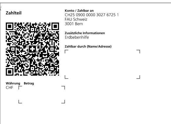 Damit Gebühren nicht unsere Spendengelder vermindern, sammelt die FAU Schweiz das Geld zuerst auf unserem Konto. Am 15. Wird der Betrag aufgerundet und an beide Organisationen überwiesen.