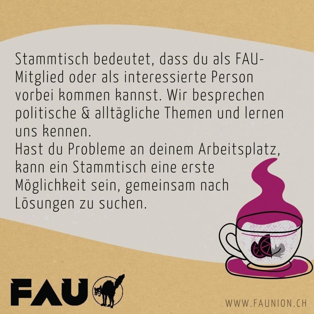 Stammtisch bedeutet, dass du als FAU-Mitglied oder als interessierte Person vorbei kommen kannst. Wir besprechen politische & alltägliche Themen und lernen uns kennen.